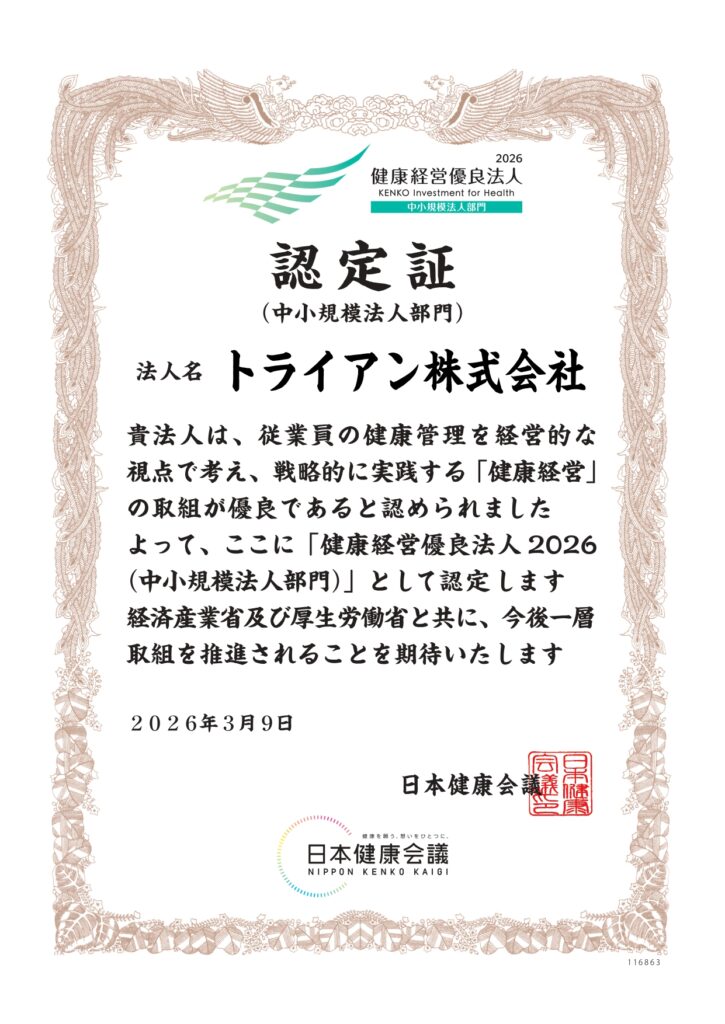 トライアン株式会社は昨年に引き続き「健康経営優良法人2026」の認定を受けました。